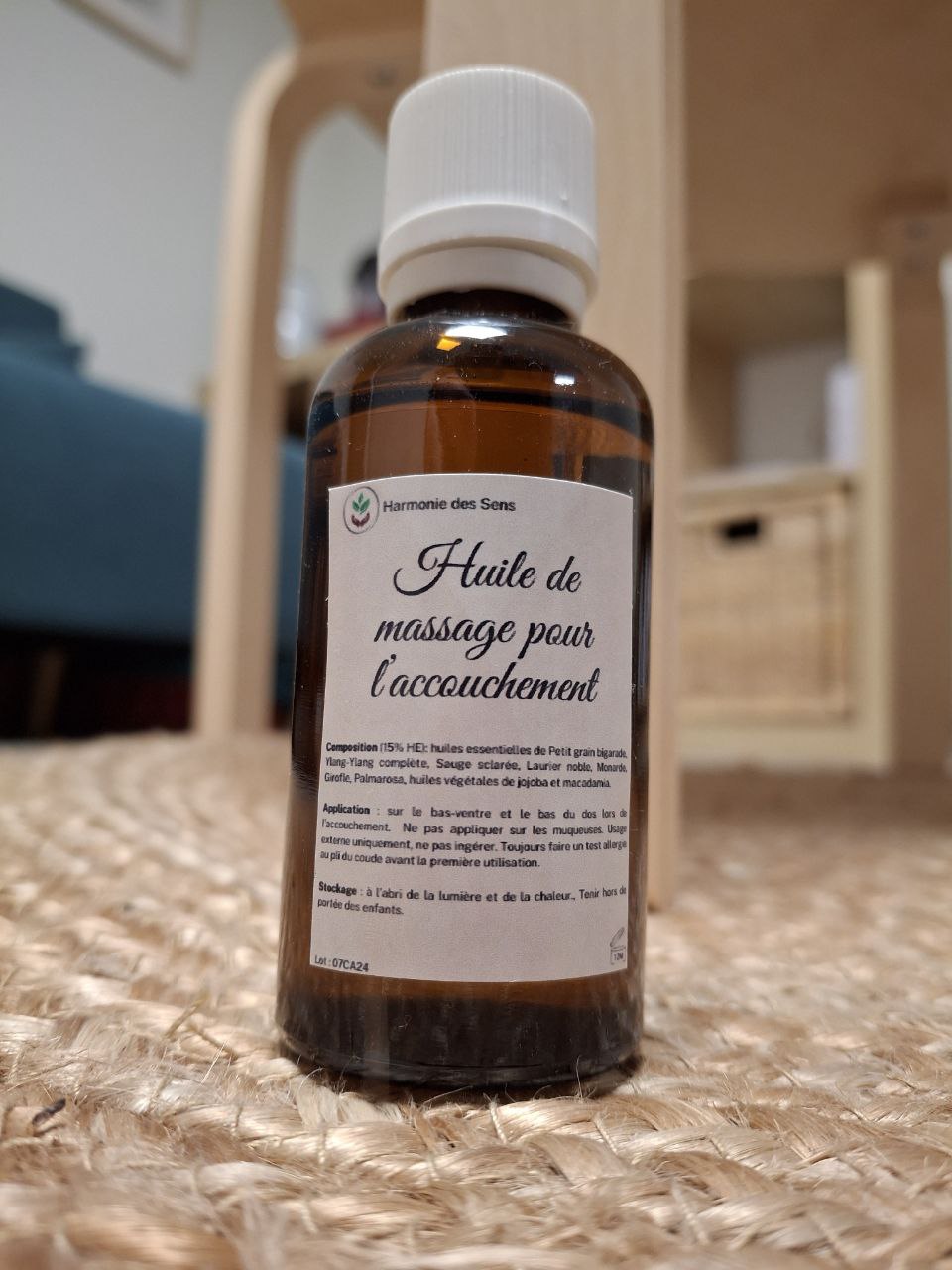 Cette huile de massage a été pensée pour accompagner en douceur le jour de l’accouchement, ou en cas de dépassement du terme, toujours dans le respect du corps et avec l’accord de la sage-femme ou du professionnel de santé qui accompagne la naissance. Utilisée en massage sur des zones ciblées, elle s’intègre comme un rituel de soutien, favorisant la détente et la présence pendant ce moment si particulier